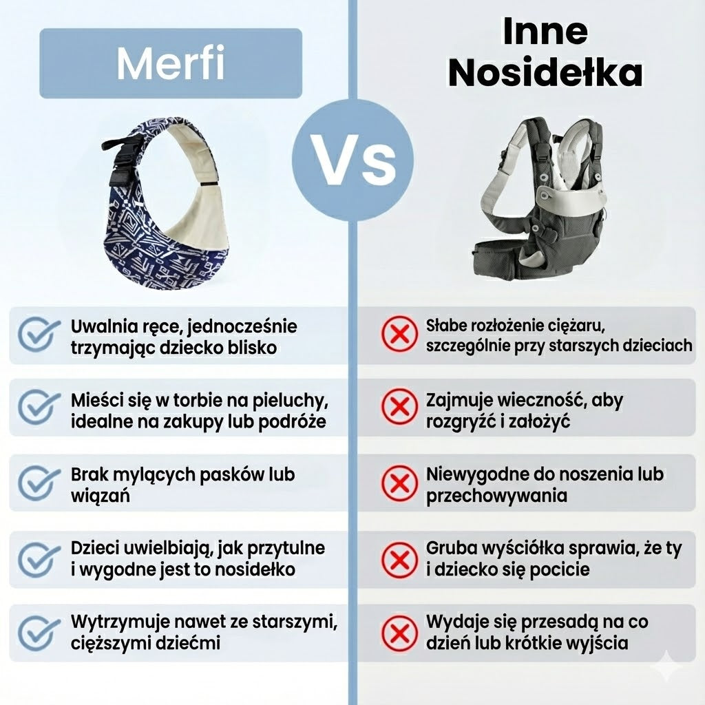 Rodzicielstwo bywa skomplikowane – nosidełko powinno być proste. Zamiast krępującej „zbroi”, Merfi daje Ci drugą parę rąk.